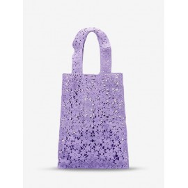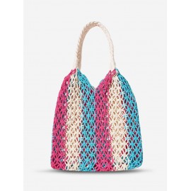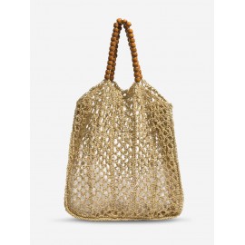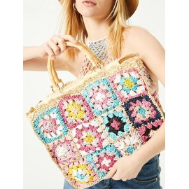 Women's Handmade Weave Random Flower Pattern Hollow Out Bamboo Joint Handle Vacation Beach Tote Bag (Random Color)