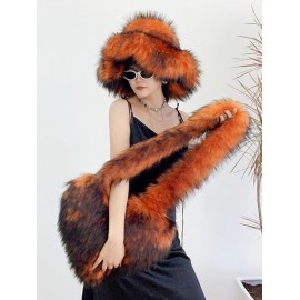 Women's Y2K Fluffy Fuzzy Furry Faux Fur Textured Top Handle Mini Bag and Matching Bucket Hat set